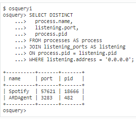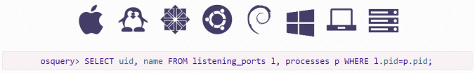 Osquery permite por ejemplo hacer consultas sobre los procesos en ejecución, usuarios, cambios en passwords, dispositivos USB, puerto abiertos,…