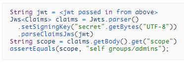 Si la firma es incorrecta, la llamada a parseClaimsJws lanzará una excepción SignatureException. Una vez analizado con éxito, las reivindicaciones individuales pueden obtenerse y comprobarse como en: String scope = claims.getBody (). Get («scope»)