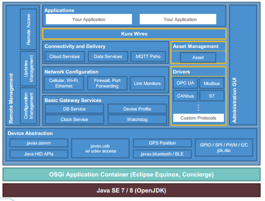 Eclipse Kura es un framework Java basado en OSGI para el desarrollo de Gateways IoT.