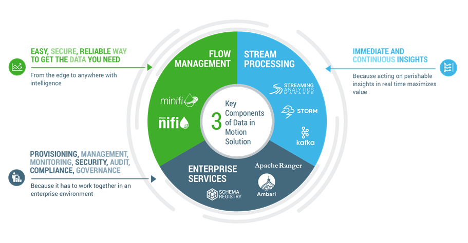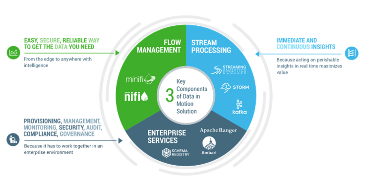 HDF es una solución que integra Apache Nifi/MiNifi, Apache Kafka, Apache Storm y Druid.