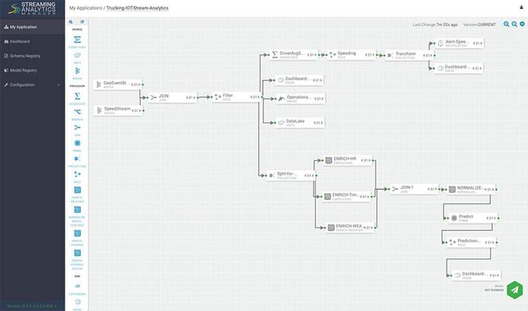 Dentro del HDF tenemos el Streaming Analytics Manager (SAM) que permite construir analítica en streaming de forma sencilla, arrastrando componentes: