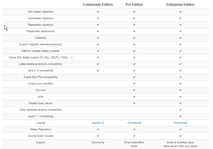 Flyway tiene 3 versiones, una Community con licencia Apache2 y 2 comerciales: