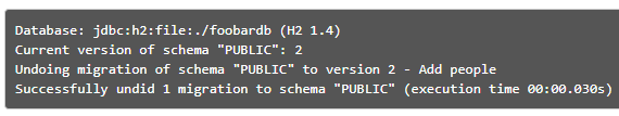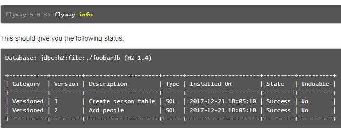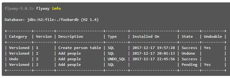 También puedo ejecutar flyway info que me da info sobre el estado de la migración: