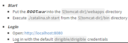 Para ejecutar Dirigible basta con descargarse el WAR de su proyecto y desplegarlo sobre un Tomcat (8.x):