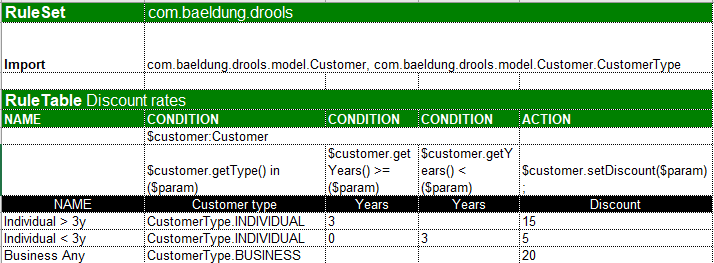 Pero hoy queríamos ver cómo usar tablas de decisión con Drools, de modo que pueda definir las reglas en Excel, y lo veremos con un ejemplo (original aquí):