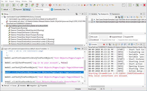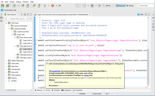 Katalon Studio esconde todas las complejidades técnicas y proporciona una interfaz de usuario amigable con el modo manual (el usuario puede arrastrar y soltar, seleccionar palabras clave y probar objetos para formar pasos de prueba), pero aún mantiene las armas necesarias para usuarios técnicamente más poderosos que pueden excavar más profundo en la codificación con el modo de guión que es totalmente compatible con las ventajas del desarrollo, como el resaltado de sintaxis, la sugerencia de código y la depuración.