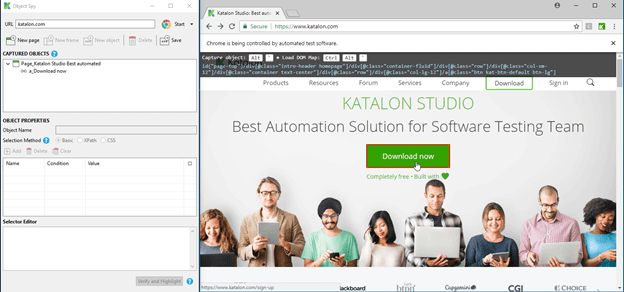 · Katalon Studio es compatible con el objeto espía para la Web (mediante el uso de complementos del navegador para IE, Firefox, Chrome) y para aplicaciones móviles (mediante el simulador de captura de pantalla). Katalon Studio también admite objetos capturados de alta iluminación en AUT: