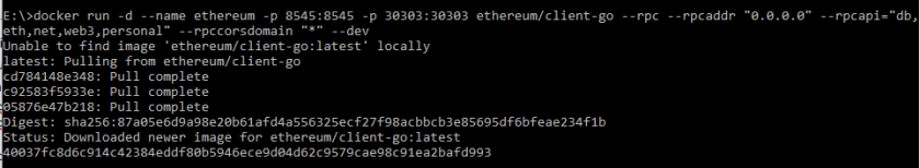 docker run -d --name ethereum -p 8545:8545 -p 30303:30303 ethereum/client-go --rpc --rpcaddr "0.0.0.0" --rpcapi="db,eth,net,web3,personal" --rpccorsdomain "*" –dev