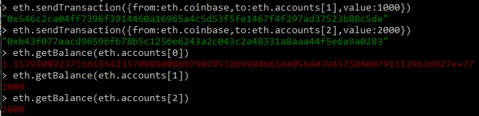 eth.sendTransaction({from:eth.coinbase,to:eth.accounts[2],value:2000})
