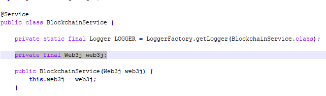 Lo primero que vemos es que tenemos inyectado un Bean Web3j. Este Bean está incluído en el starter web3j, y se encarga de enviar transacciones al nodo cliente Geth y recibir la respuesta.