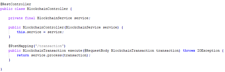 Comencemos por ver cómo se generan transacciones, para eso vamos a la clase srcmainjavaplpiominserviceblockchainserviceBlockchainService