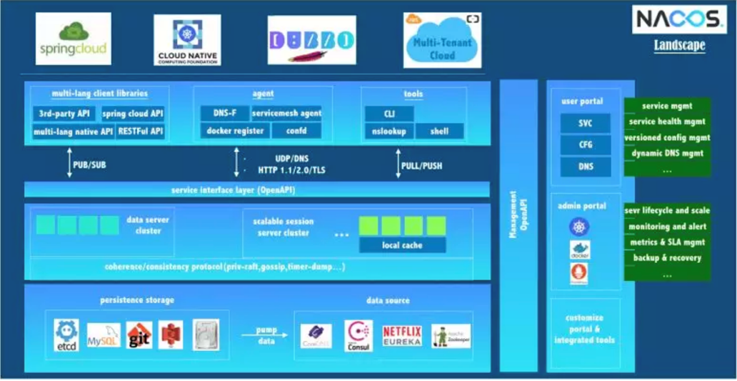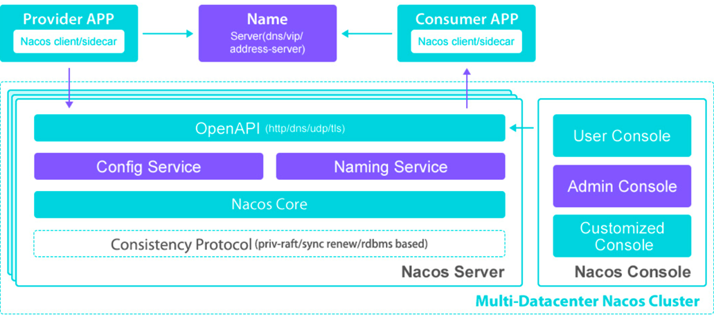 Las 2 piezas principales de NACOS son el Config Service y el Naming Service, sobre el que provee un API Open API unificada: