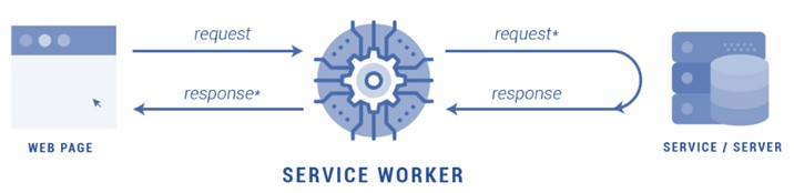 Un Service Worker en una aplicación PWA no es más que un intermediario entre el navegador/aplicación y el servidor responsable de procesar las peticiones: