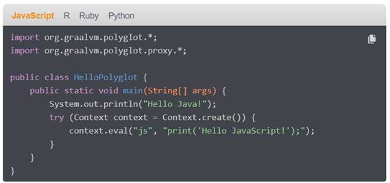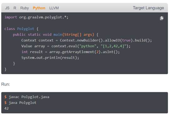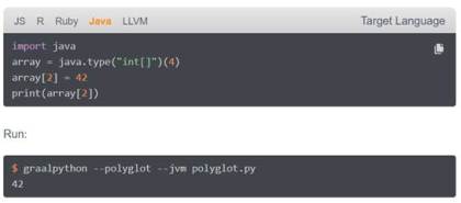 - Interoperabilidad entre lenguajes en un entorno compartido, en el ejemplo vemos cómo sobre Java podemos ejecutar. Por ejemplo podemos ver cómo sobre Java podemos ejecutar Javascript, R, Python,…