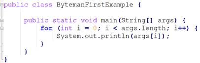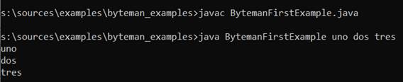 java -javaagent:%BYTEMAN_HOME%/lib/byteman.jar=script:BytemanFirstRule.btm BytemanFirstExample uno dos tres