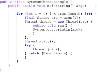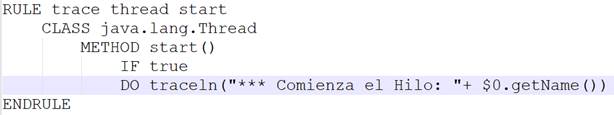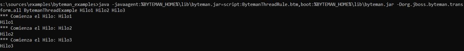 java -javaagent:%BYTEMAN_HOME%libbyteman.jar=script:BytemanThreadRule.btm,boot:%BYTEMAN_HOME%libbyteman.jar -Dorg.jboss.byteman.transform.all BytemanThreadExample Hilo1 Hilo2 Hilo3