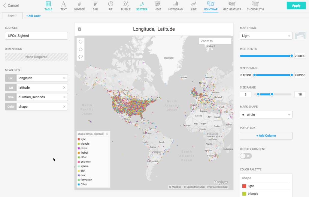 - Es un inerfaz web para la visualización generada por OmniSci Render. Provee visualizaciones estándares (gráficos de diversos tipos) además de otras más complejas.