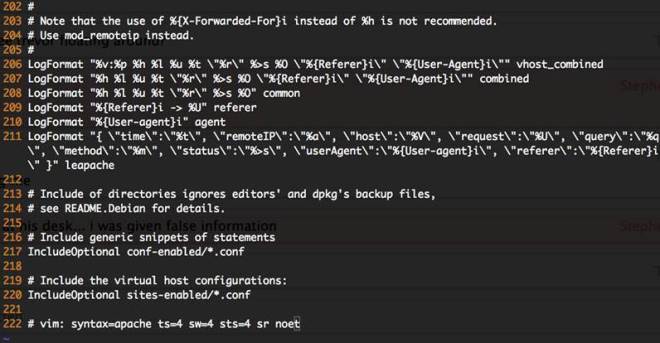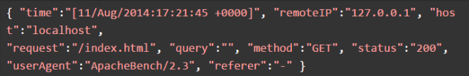 LogFormat «{ «time»:»%t», «remoteIP»:»%a», «host»:»%V», «request»:»%U», «query»:»%q», «method»:»%m», «status»:»%>s», «userAgent»:»%{User-agent}i», «referer»:»%{Referer}i» }» leapache