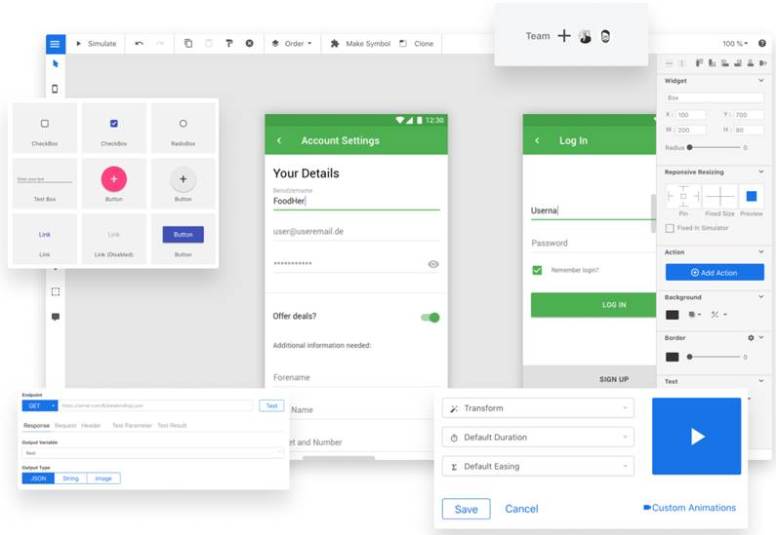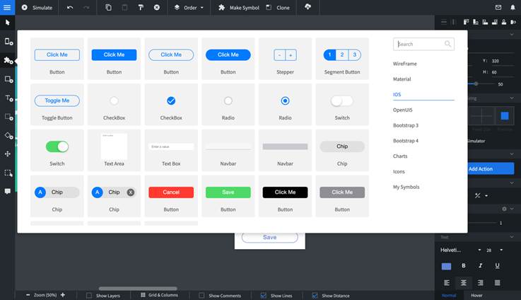 - Un potente editor visual para la creación de bocetos/prototipos a partir de una paleta muy completa con diferentes estilos (Wireframe, IOS, Android, OpenUI5)