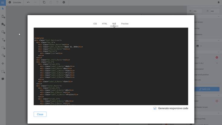 - Generación de código en HTML y Vue: