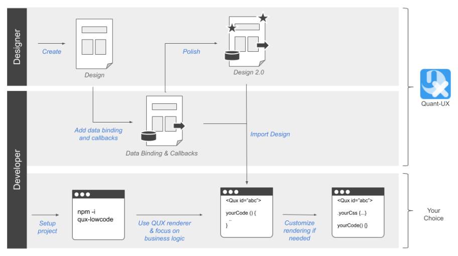 Si Quant-UX es una herramienta open-source para el diseño y creación de interfaces de usuario, su paquete QUX-LowCode permite a través de su componente Vue QUXrenderizar el diseño visual en Vue y permitir que los desarrolladores se centren en la lógica de negocio.