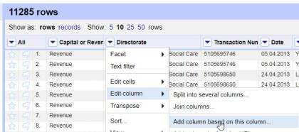 Como podéis ver es una extensión Jython. Una vez instalada puedo usarla, elegiré una columna sobre la que quiera hacer transformaciones (en mi caso Directorate), seleccionaré Edit column>Add column based on this column
