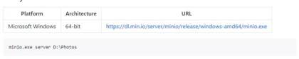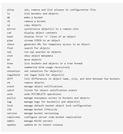 Además de disponer de un cliente por línea de comandos (mc) que provee comandos equivalentes a los de Linux (cat, ls, cat, mirror, diff), que de nuevo puede ejecutarse para todos los sistemas operativos además de con Docker: