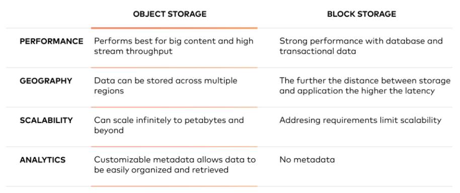 Esencialmente, el almacenamiento de objetos funciona muy bien para los grandes contenidos y alto throughput, permite que los datos se almacenen en varias regiones, se escalan infinitamente hasta los petabytes y más allá, y ofrece metadatos personalizables para ayudar a recuperar los archivos.