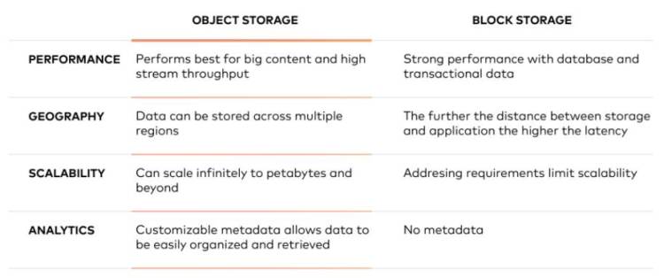 El almacenamiento de objetos se diferencia del almacenamiento de archivos y del almacenamiento de bloques en que guarda los datos en un "objeto" en lugar de en un bloque para formar un archivo. Los metadatos se asocian a ese archivo, lo que elimina la necesidad de la estructura jerárquica utilizada en el almacenamiento de archivos: no hay límite a la cantidad de metadatos que se pueden utilizar. Todo se coloca en un espacio de direcciones plano, que es fácilmente escalable.