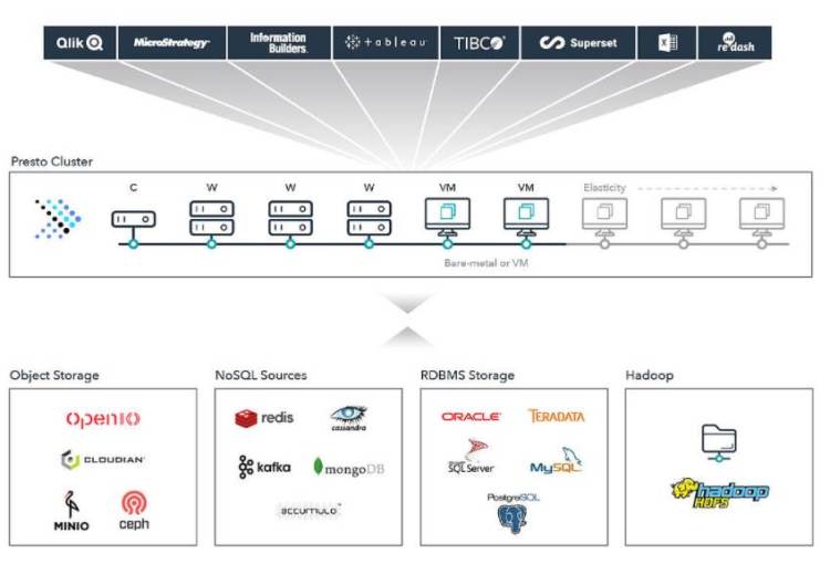 Presto es un motor de consulta ANSI-SQL, permite consultar y manipular datos en cualquier fuente de datos conectada con las mismas sentencias, funciones y operadores SQL.