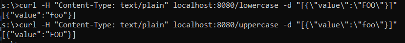curl -H «Content-Type: text/plain» localhost:8080/uppercase -d «[{«value»:»foo»}]»
