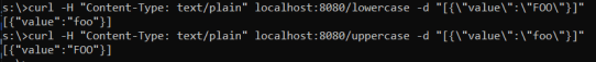 curl -H «Content-Type: text/plain» localhost:8080/lowercase -d «[{«value»:»FOO»}]»