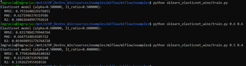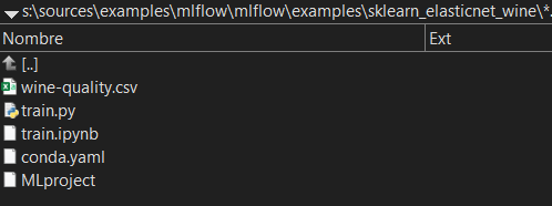 Dentro de examples tenemos la carpeta sklearn_elasticnet_wine que es una regresión lineal para predecir la calidad del vino basado en características del vino como “fixed acidity”, “pH”, “residual sugar” que vienen en el dataset wine-quality.csv