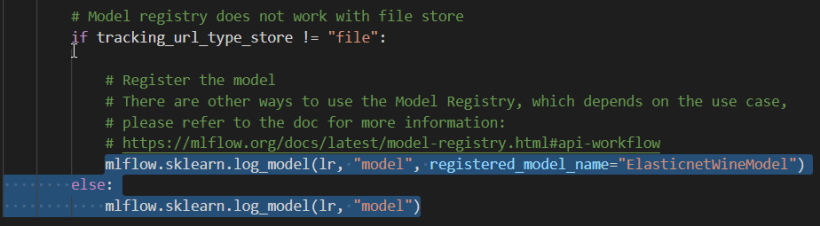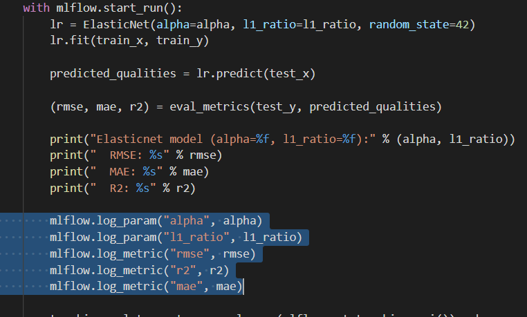 El código está en el fichero train.py (https://github.com/mlflow/mlflow/blob/master/examples/sklearn_elasticnet_wine/train.py)
