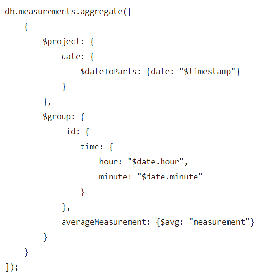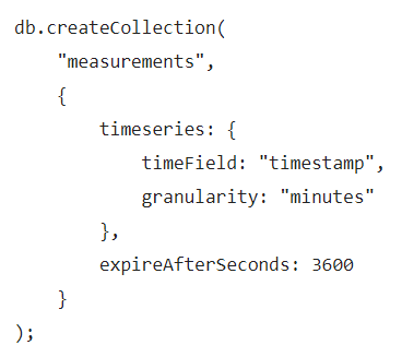 En el ejemplo estamos definiendo una colección de series temporales llamada measurements, su granularidad se establece en minutos y los documentos de la colección se borrarán automáticamente después de una hora.