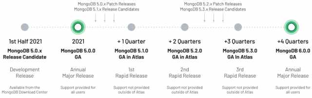 El 13 de julio de 2021 se publicó la major release v5.0 de MongoDB,, Esta versión llega después de Mongo 4.4 y lo hace con el objetivo de la empresa de ofrecer nuevas características con más rapidez, de modo que a partir de Mongo 5.0 se publicarán releases cada trimestre, y una mayor release cada año.
