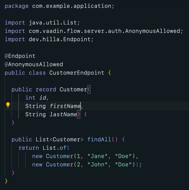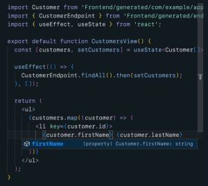 - Acceso al servidor seguro: Simplifica el acceso seguro a los datos desde el cliente. Basta con crear las clases Java con Spring Boot de endpoint e Hilla se encargue del resto, sin necesidad de crear un API REST. Llamar a un método back-end es tan sencillo como llamar a una función TypeScript asíncrona.