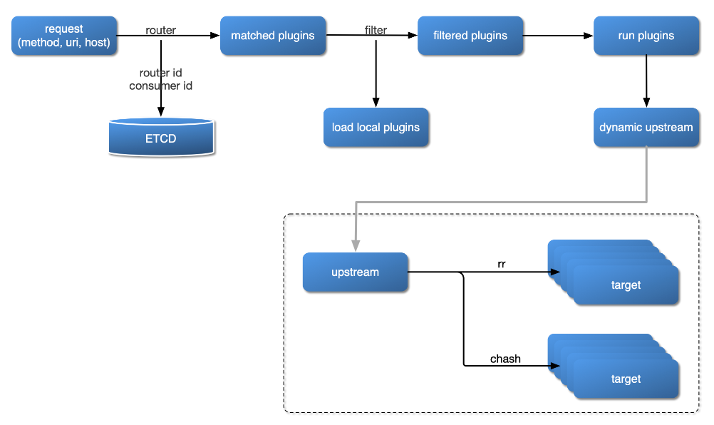 - Route: La ruta coincide con la solicitud del cliente mediante la definición de reglas, luego carga y ejecuta el plugin correspondiente basado en el resultado coincidente, y reenvía la solicitud al Upstream especificado."