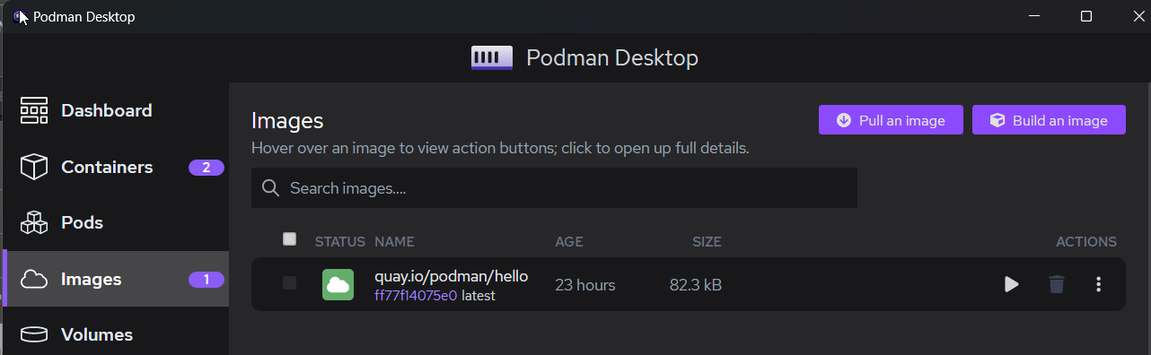 Una vez tengo instalado y arrancado podman puedo lanzar imágenes desde cualquier línea de comandos, como con podman start quay.io/podman/hello